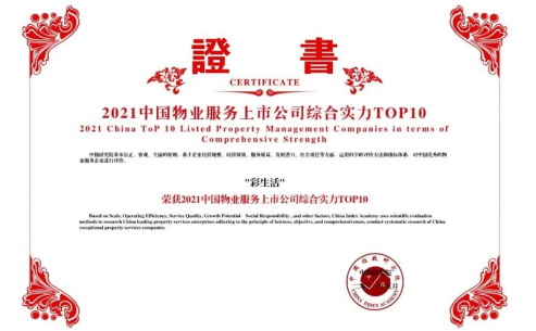 2021年4月22日,2021中國物業(yè)服務百強企業(yè)研究成果發(fā)布會上,彩生活服務集團榮獲“2021中國物業(yè)服務百強企業(yè)”第七名、“2021中國物業(yè)服務百強企業(yè)服務規(guī)?!钡谒拿?、“2021中國互聯(lián)網社區(qū)運營領先企業(yè)”、“2021中國物業(yè)科技賦能領先企業(yè)”多項大獎。